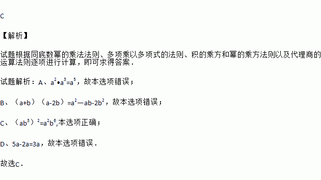 C. (ab3)2=a2b6 D. 5a-2a=3