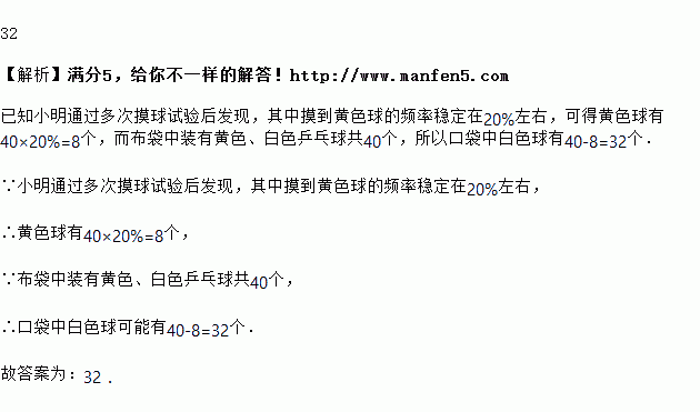 在一个不透明的布带中装有黄色、白色乒乓球共个,除颜色外其他完全相同.小明通过多次摸球试验后发现,其中摸到黄色球的频率稳定在左右,则口袋中白色球可能有________个.