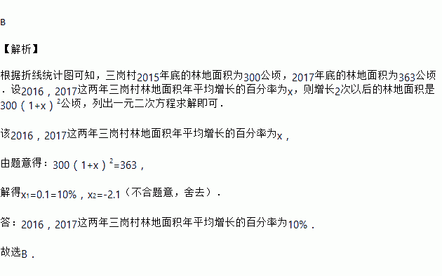 随着退耕还林政策的进一步落实,三岗村从2015年底到2017年底林地面积变化如图所示,则2016,2017这两年三岗村林地面积年平均增长的百分率为( )