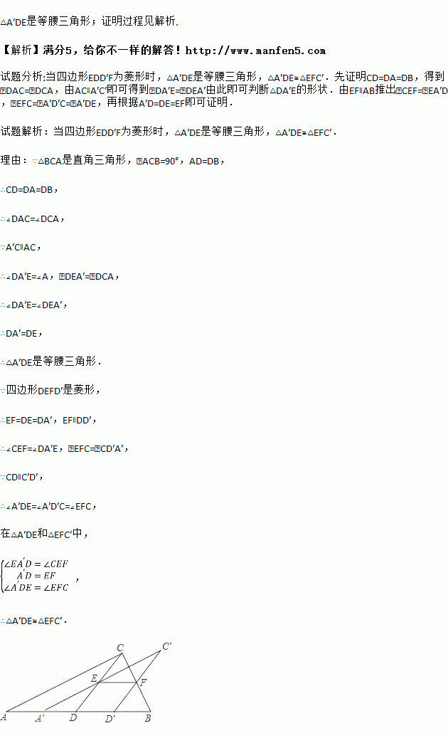 如图,将一张直角三角形ABC纸片沿斜边AB上的中线CD剪开,得到△ACD,再将△ACD沿DB方向平移到△A′C′D′的位置,若平移开始后点D′未到达点B时,A′C′交CD于E,D′C′交CB于点F,连接EF,当四边形EDD′F为菱形时,试探究△A′DE的形状,并判断△A′DE与△EFC′是否全等?请说明理由.