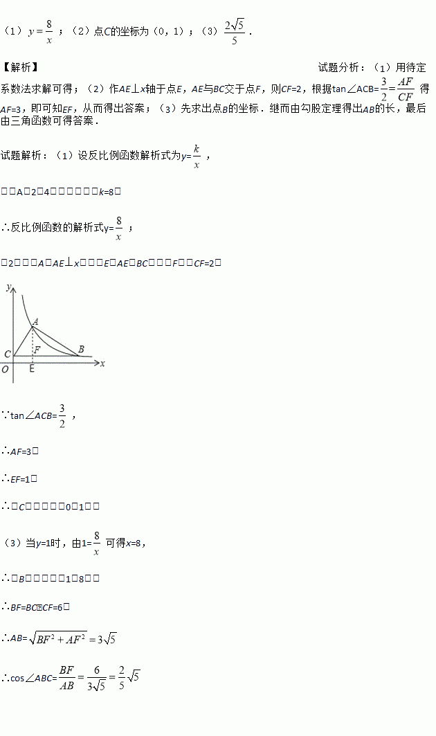 已知:如图,第一象限内的点A,B在反比例函数的图象上,点C在y轴上,BC∥x轴,点A的坐标为(2,4),且tan∠ACB=![]()