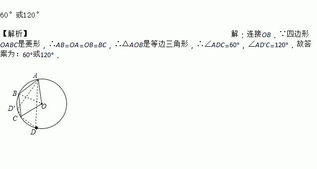 如图,A、B、C是⊙O上的三点,且四边形OABC是菱形.若点D是圆上异于A、B、C的另一点,则∠ADC的度数是_______________.