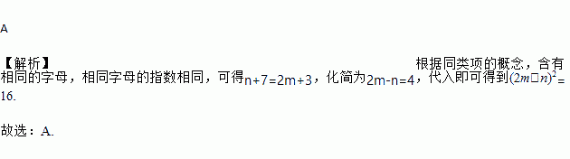 A 【解析】根据同类项的概念,含有相同的字母,相同字母的指数相同,可得n+7=2m+3,化简为2m-n=4,代入即可得到(2m-n)2=16. 故选:A.