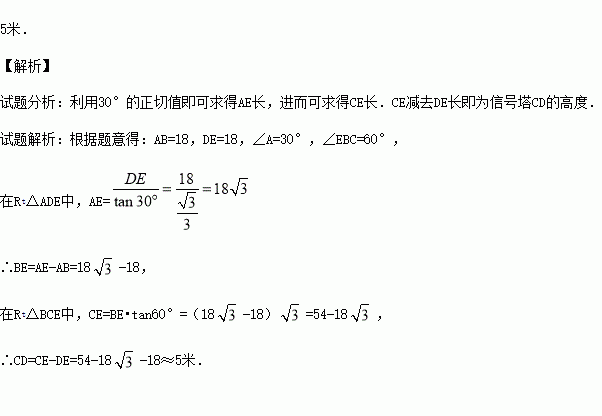如图,在一个18米高的楼顶上有一信号塔DC,李明同学为了测量信号塔的高度,在地面的A处测的信号塔下端D的仰角为30°,然后他正对塔的方向前进了18米到达地面的B处,又测得信号塔顶端C的仰角为60°,CD⊥AB与点E,E、B、A在一条直线上.请你帮李明同学计算出信号塔CD的高度(结果保留整数,