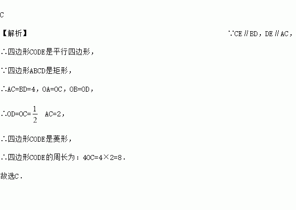 如图,矩形ABCD的对角线AC、BD相交于点O,CE∥BD,DE∥AC.若AC=4,则四边形CODE的周长是( )