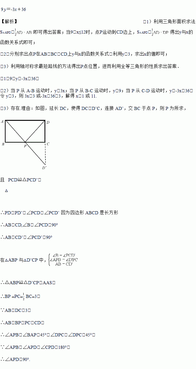 如图 1,长方形 ABCD 中,AB=3cm,BC=6cm,P 为矩形 ABCD 上的动点,动点 P 从 A 出发,沿着 A-B-C-D 运动到 D 点停止,速度为 1cm/s,设点 P 运动时间为 x 秒,△APD 的面积为 ycm².