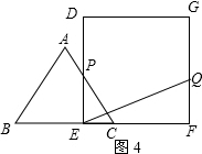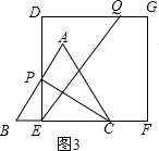 (3)如图3,若四边形DEFG为边长为4$\sqrt{3}$的正方形,△ABC的移动速度为每秒$\sqrt{3}$个单位长度,其余条件保持不变.△ABC开始移动的同时,Q点从F点开始,沿折线FG-GD以每秒2$\sqrt{3}$个单位长度开始移动,△ABC停止运动时,Q点也停止运动.设在运动过程中,DE交折线BA-AC于P点,则是否存在t的值,使得PC⊥EQ?若存在,请求出t的值;若不存在,请说明理由.