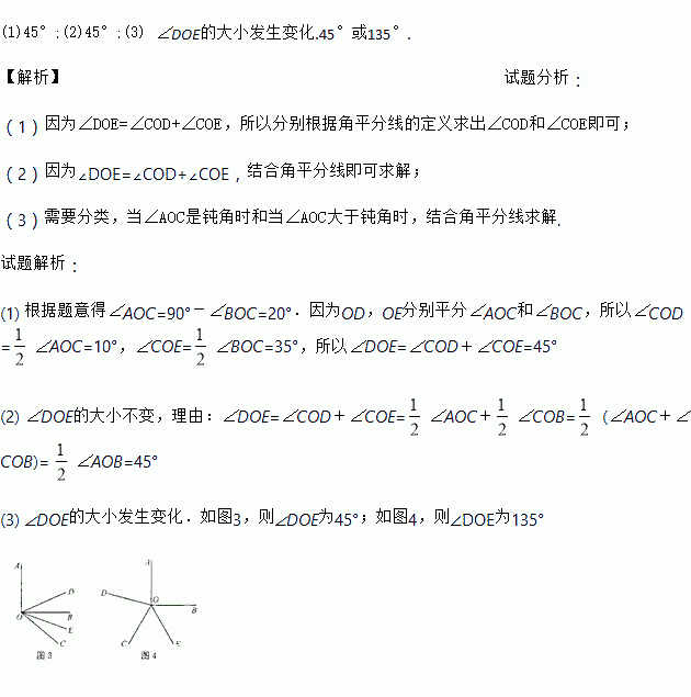 (3) 当射线OC在∠AOB外绕点O旋转且∠AOC为钝角时,画出图形,直接写出相应的∠DOE的度数.(不必写出过程)