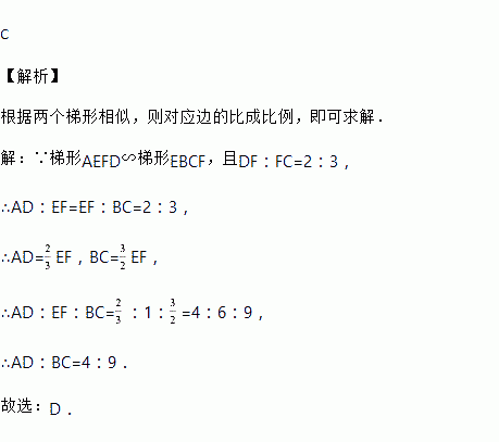 如图,梯形中,,、两点分别在、上.若,,,,且梯形与梯形相似,则与的长度比为何?( )