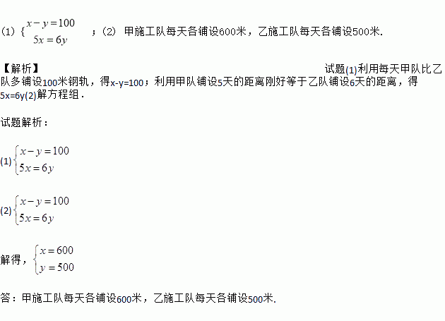甲乙两个施工队在六安(六盘水——安顺)城际高铁施工中,每天甲队比乙队多铺设100米钢轨,甲队铺设5天的距离刚好等于乙队铺设6天的距离,若设甲队每天铺设x米,乙队每天铺设y米.