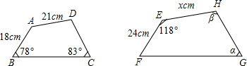 分析:观察图形,根据相似多边形的对应角相等可得出α=∠C=83°,∠F=∠B=78°,再根据四边形的内角和等于360°可计算求出β的大小,然后根据相似多边形的对应边成比例即可求出EH的长度x.