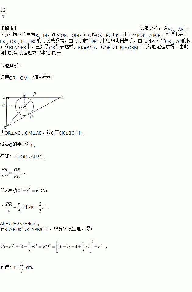 如图,△ABC中,∠C=90°,AC=8cm,AB=10cm,点P由点C出发以每秒2cm的速度沿CA向点A运动(不运动至A点),⊙O的圆心在BP上,且⊙O分别与AB、AC相切,当点P运动2秒钟时,求⊙O的半径.