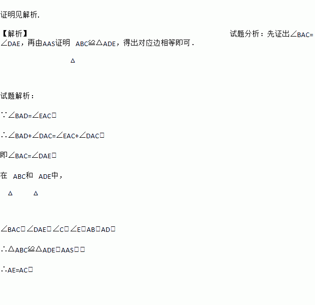 如图,AB=AD,∠BAD=∠EAC,∠C=∠E,求证:AE=AC。
