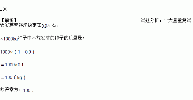 100 【解析】试题分析:∵大量重复试验发芽率逐渐稳定在0.9左右, ∴1000kg种子中不能发芽的种子的质量是: 1000×(1-0.9) =1000×0.1 =100(kg) 故答案为:100.