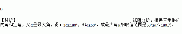 锐角三角形中,最大角α的取值范围是( )