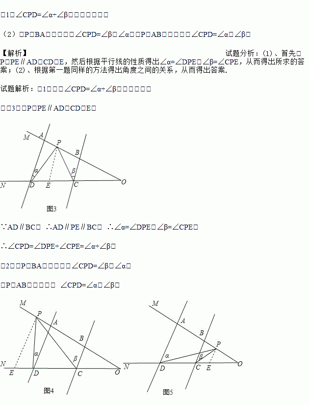 (1)如图3,AD∥BC,点P在射线OM上运动,当点P在A、B两点之间运动时,∠ADP=∠α,∠BCP=∠β.试判断∠CPD、∠α、∠β之间有何数量关系?请说明理由;