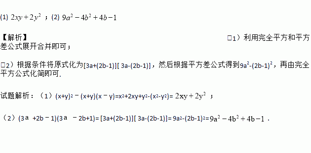 (1)、(x+y)2﹣(x+y)(x﹣y) (2)、(3+2b﹣1)(3﹣2b+1)
