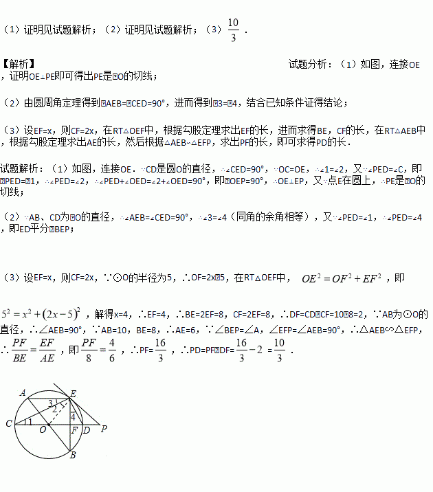(3)若⊙O的半径为5,CF=2EF,求PD的长.