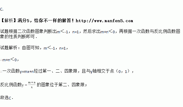 已知函数y=-(x-m)(x-n)(其中m<n)的图象如图所示,则一次函数y=mx+n与反比例函数y=的图象可能是( )