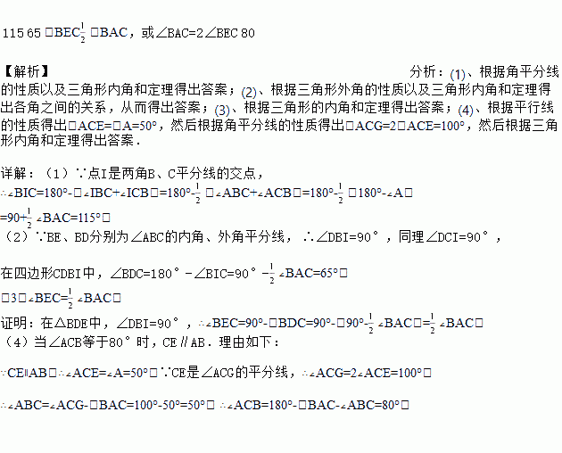 小明在学了三角形的角平分线后,遇到下列4个问题,请你帮他解决.如图,在△ABC中,∠BAC= 50°,点I是∠ABC、∠ACB平分线的交点.