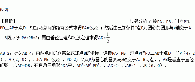 如图,以点P为圆心的圆弧与x轴交于A,B;两点,点P的坐标为(4,2)点A的坐标为(2,0)则点B的坐标为___________.