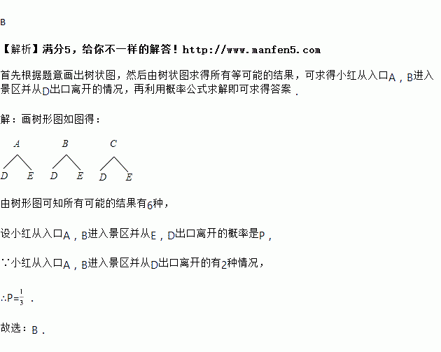 如图,某景区有A,B,C三个入口,D,E两个出口,小红任选一个入口进入景区,游玩后任选一个出口离开,则她选择从A或B入口进入,从D出口离开的概率是( )