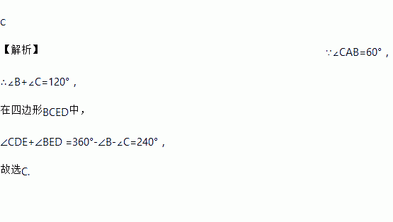 C 【解析】∵∠CAB=60°, ∴∠B+∠C=120°, 在四边形BCED中, ∠CDE+∠BED =360°-∠B-∠C=240°, 故选C.
