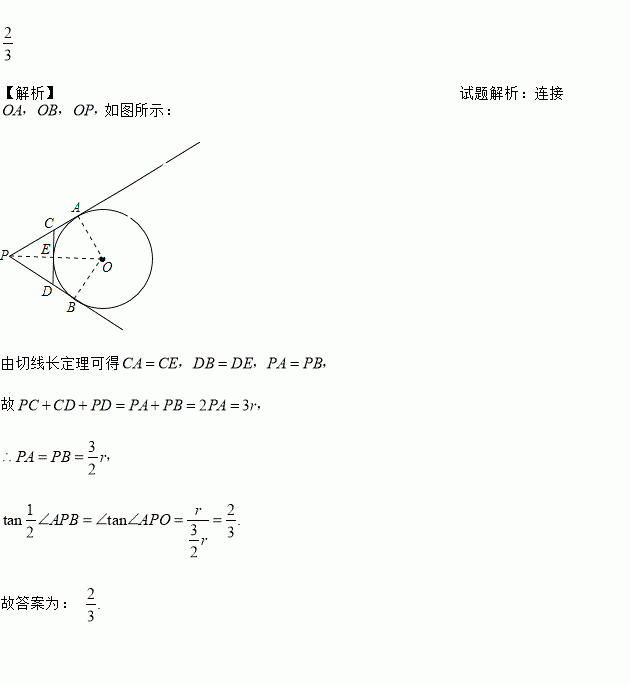 如图,PA,PB切⊙O于A,B两点,CD切⊙O于点E,交PA,PB于C,D,若⊙O的半径为r,△PCD的周长等于3r,则tan∠APB的值是________