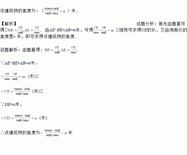 如图,为了测量某建筑物CD的高度,先在地面上用测角仪自A处测得建筑物顶部的仰角是α,然后在水平地面上向建筑物前进了m米,此时自B处测得建筑物顶部的仰角是β.已知测角仪的高度是n米,请你计算出该建筑物的高度.