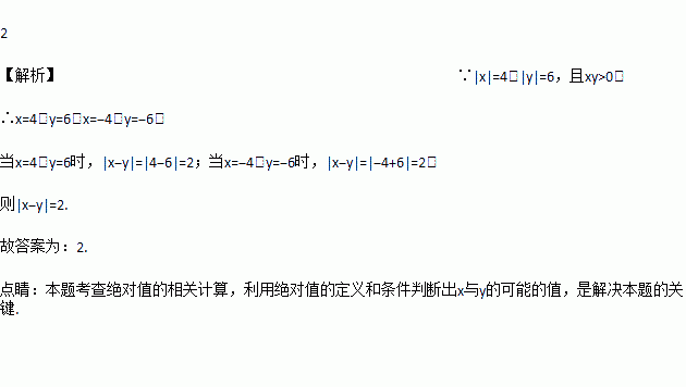 ∣x∣=4, ∣y∣=6,且xy>0,则∣x-y∣=_____