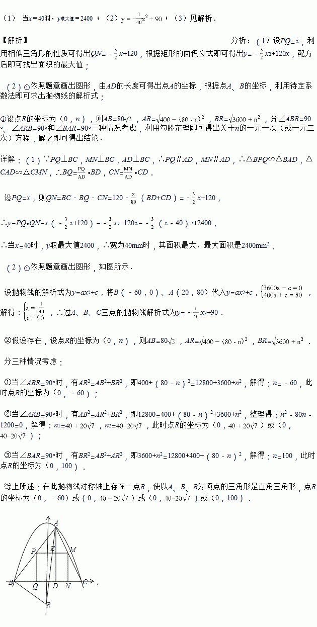 £¨1£©Èç¹û°ÑËü¼Ó¹¤³É³¤·½ÐÎÁã¼þ£¬Ê¹³¤·½ÐεÄÒ»±ßÔÚBCÉÏ£¬ÆäÓàÁ½¸ö¶¥µã·Ö±ðÔÚAB¡¢ACÉÏ£¬É賤·½Ðοíxmm£¬Ãæ»ýΪymm2£¬ÄÇô¿íΪ¶àÉÙʱ£¬ÆäÃæ»ý×î´ó£®×î´óÃæ»ýÊǶàÉÙ£¿