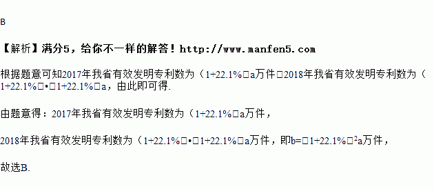 据省统计局发布,2017年我省有效发明专利数比2016年增长22.1%.假定2018年的年增长率保持不变,2016年和2018年我省有效发明专利分别为a万件和b万件,则( )
