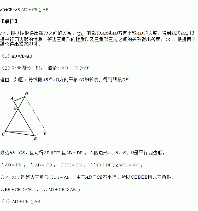 如图1有两条长度相等的相交线段AB、CD,它们相交的锐角中有一个角为60°,为了探究AD、CB与CD(或AB)之间的关系,小亮进行了如下尝试: