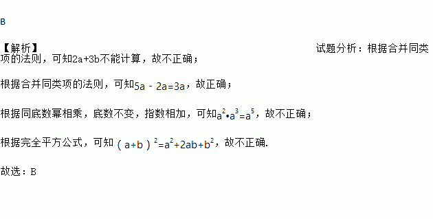 A. 2a+3b=5ab B. 5a﹣2a=3a C. a2•a3=a6 D. (a+b)2=a2+b2