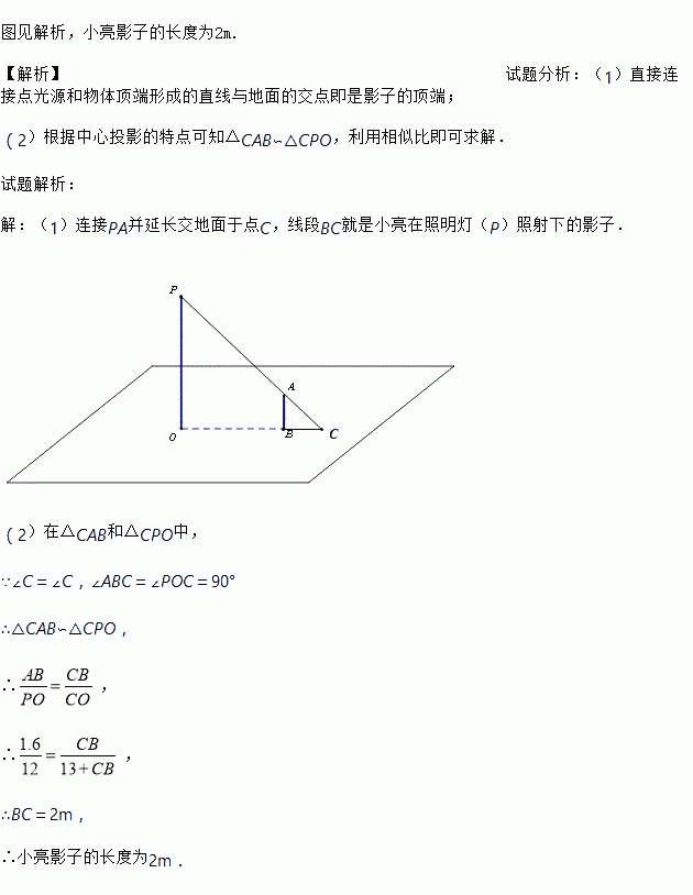 请你再图中画出小亮在照明灯P照射下的影子BC;