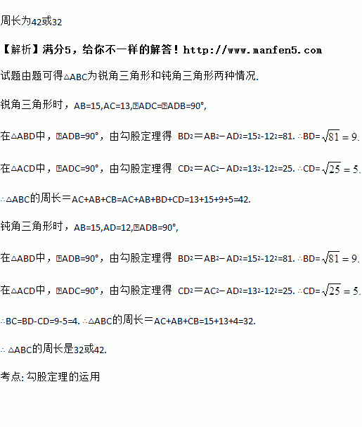在△ABC中,AB=15,AC=13,BC边上高AD=12,试求△ABC周长。