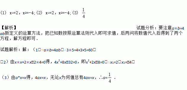 (1) x1=2,x2=-4;(2) x1=2,x2=-4;(3) 【解析】试题分析:要注意a※b=4ab新定义的运算方法,把已知数按照运算法则代入即可求值,后两问将数值代入后得到了两个方程,解方程即可. 试题解析:【解析】 (1)∵a※b=4ab,∴3※5=4×3×5=60; (2)由x※x+2※x﹣2※4=0得,4x2+8x﹣32=0,即x2+2x﹣8=0,∴x1=2,x2...
