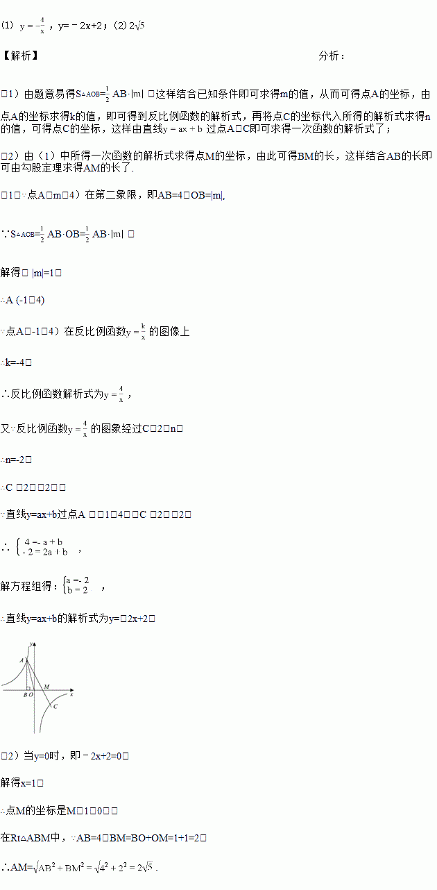 的图象经过第二象限内的点A(,4),AB⊥x轴于点B,△AOB的面积为2,若直线![]()
