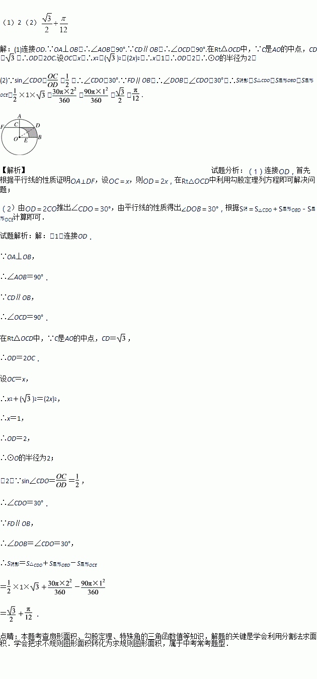 (2016·新疆中考)如图,在⊙O中,半径OA⊥OB,过OA的中点C作FD∥OB交⊙O于D、F两点,且CD=