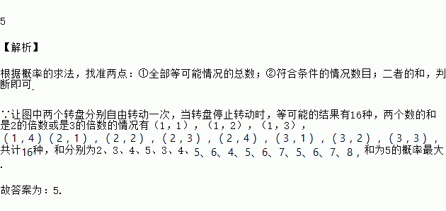 让图中两个转盘分别自由转动一次,当转盘停止转动时,两个指针分别落在某两个数所表示的区域,则这两个数的和为________的概率最大.
