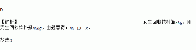 在“爱护环境,建我家乡”的活动中,七(1)班学生回收饮料瓶共10kg,男生回收的质量是女生的4倍,设女生回收饮料瓶x kg,根据题意可列方程为( )