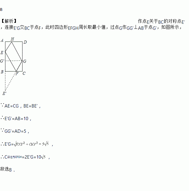 如图,矩形ABCD中,AB=10,BC=5,点E,F,G,H分别在矩形ABCD各边上,且AE=CG,BF=DH,则四边形EFGH周长的最小值为( )