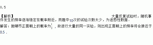 某同学做抛硬币实验,共抛10次,结果为3正7反,若再进行大量的同一实验,则出现正面朝上的频率将会接近于___.