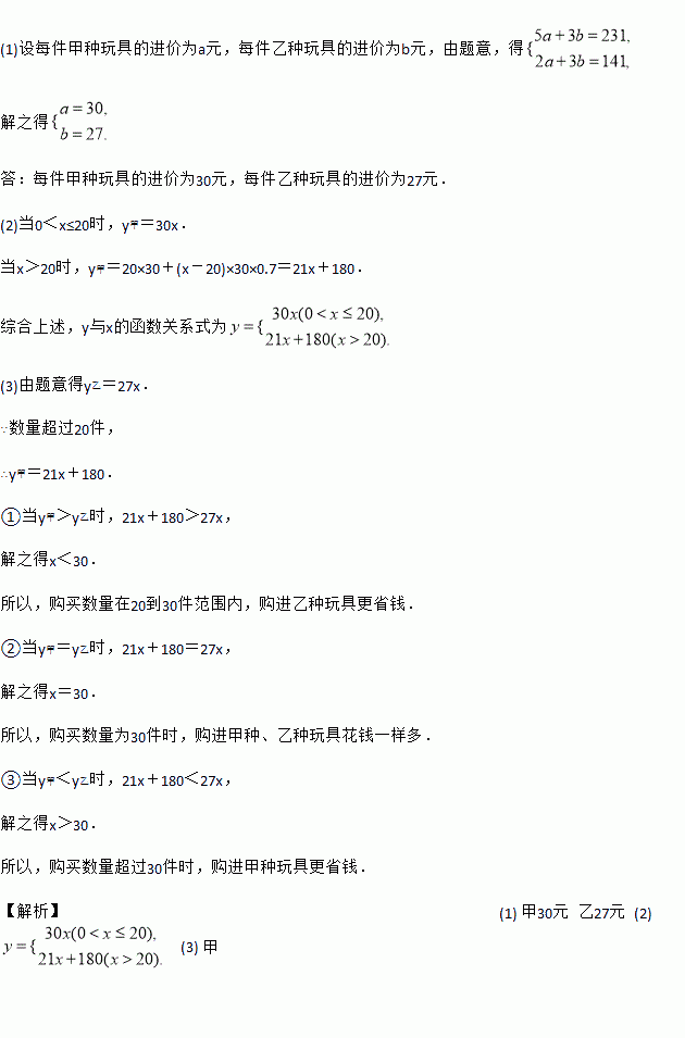 (3)在(2)的条件下,超市决定在甲、乙两种玩具中选购其中一种,且数量超过20件,请你帮助超市判断购进哪种玩具省钱.