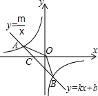 分析:将A坐标代入反比例解析式中求出m的值,确定出反比例解析式,将B坐标代入求出n的值,确定出B坐标,将A与B坐标代入一次函数解析式求出k与b的值,确定出一次函数解析式,设一次函数与x轴交于C点,求出C坐标,三角形AOB面积=三角形AOC面积+三角形BOC面积,求出即可.
