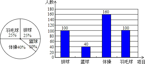 (2)选羽毛球的学生=总人数×选羽毛球的人数所占百分比;因为选排球的人数和篮球的人数,分别除以总数即可求得占报名总人数的百分比;