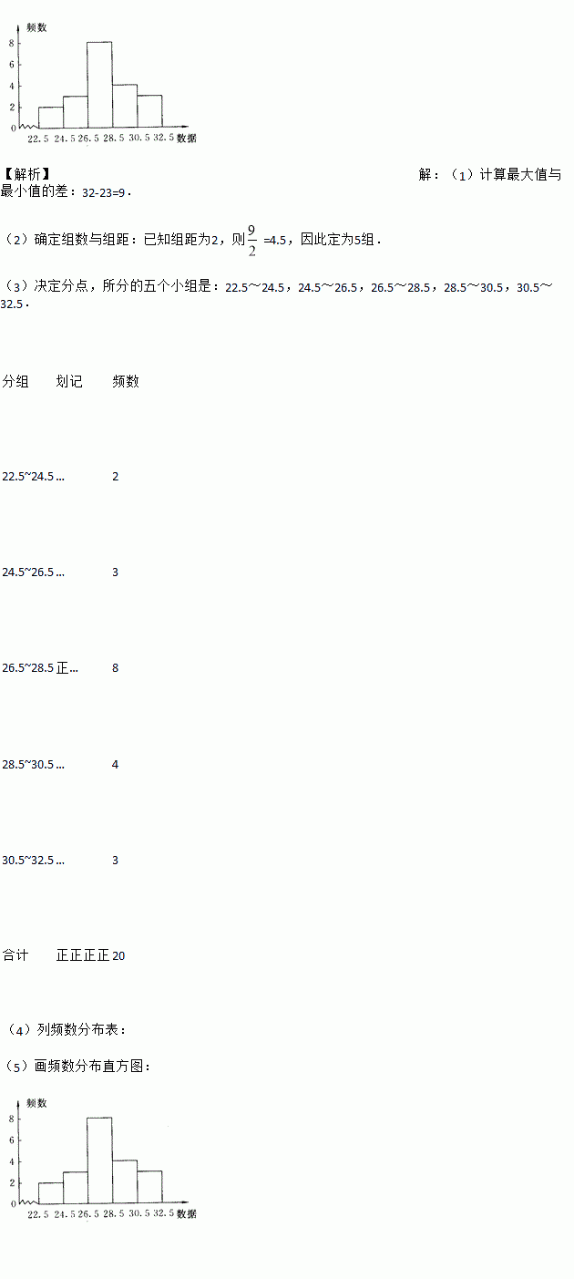 已知一个样本,27,23,25,27,29,31,27,30,32,31,28,26,27,29,28,24,26,27,28,30,以2为组距画出频数分布直方图