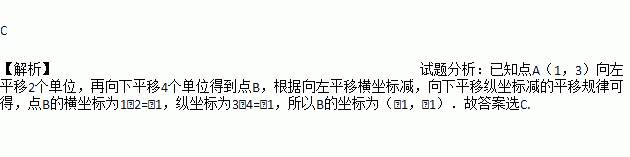 若将点A(1,3)向左平移2个单位,再向下平移4个单位得到点B,则点B的坐标为( )