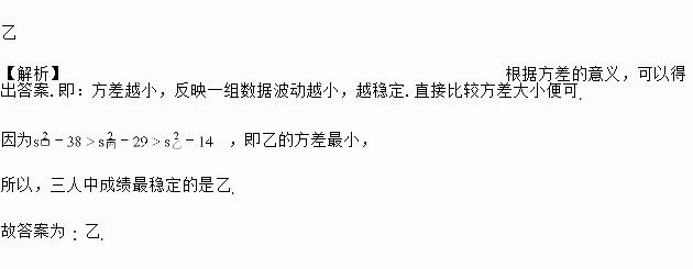 甲、乙、丙三名同学在本学期几次数学测验中,三人的平均成绩都是96分同,方差分别为:,,,则三人中成绩最稳定的是_______.