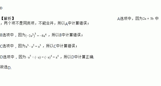 A. 2a+3b=5ab B. (﹣2a2)3=6a6 . a3•a2=a6 D. ﹣a5÷(﹣a)=a4